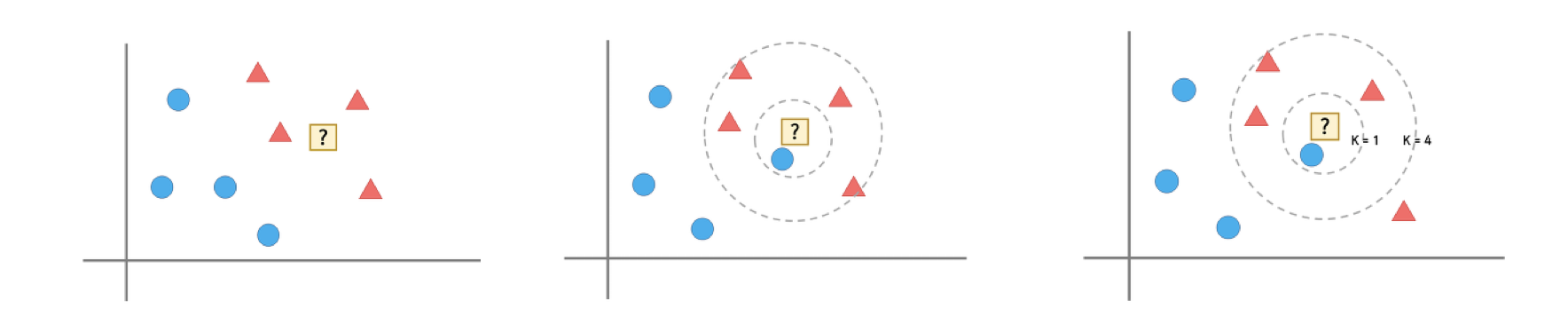최근접 이웃 알고리즘은 “?”의 주변에 있는 것이 세모이기 때문에 세모라고 판단합니다. 하지만 단순히 가장 가까이에 있는 것과 같다고 선택하는것이 옮은 분류가 아니기 때문에 주변의 범위를 나누어 제일 많이 포함되는 분포를 나누게 됩니다.