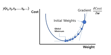경사 하강법에서는 오차가 줄어들도록 가중치와 오차를 조정합니다.