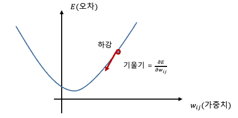 그래프에서 가로축 w_ij는 가중치, 세로축은 E는 오차 입니다.