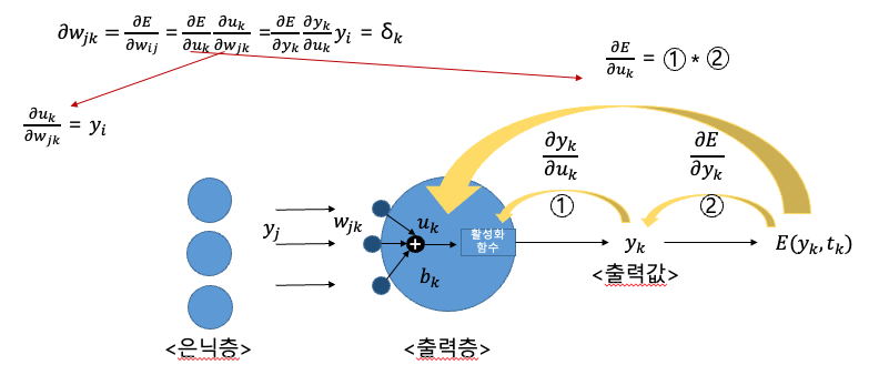 정리하면, 위 그림 2에서 오차를 출력층 뉴런의 출력으로 편미분한 것과 그 결과값을 u_k로 편미분한 것의 곱이 됩니다.