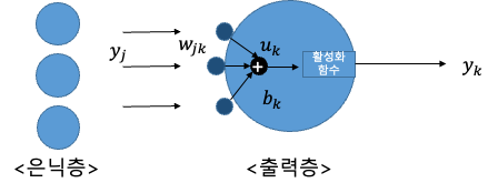 w_jk를 출력층에서의 가중치, b_k를 편향, u_k를 가중치와 입력값 곱셈의 총합에 편향을 더한 값으로 표시합니다. 가중치는 은닉층의 출력과 관련있기 때문에 j,k 첨자 2개가 필요합니다. 은닉층의 출력은 y_j 라고 표시하면, 출력층 뉴런은 다음 그림과 같이 표현 할 수 있습니다.