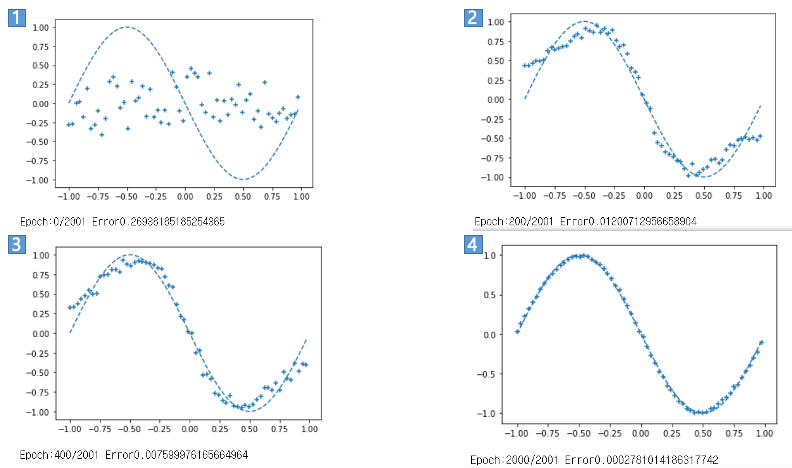 결과를 설명하자면 1, 2, 3, 4 순으로 경사하강법을 1차례 학습한 경우, 2차례, 3차례 최종 4차례 줬을 때 정확도의 차이를 표현한 것이다.