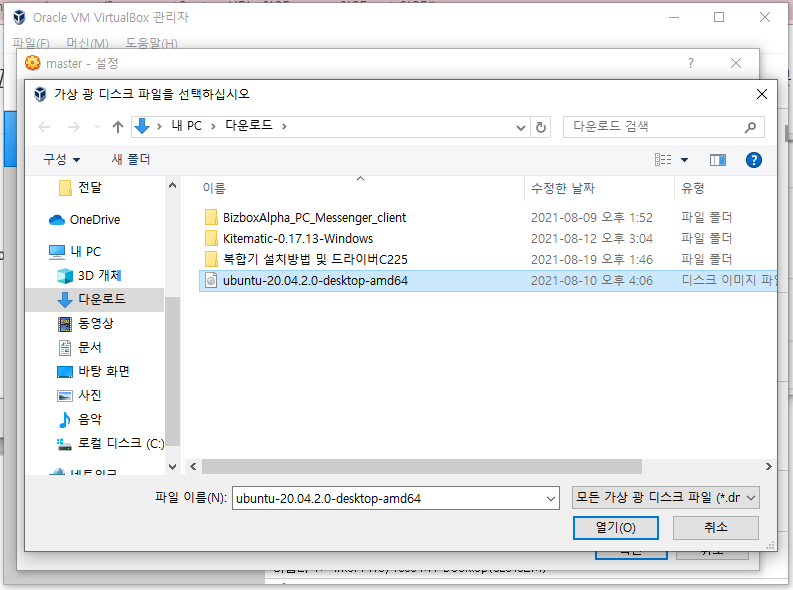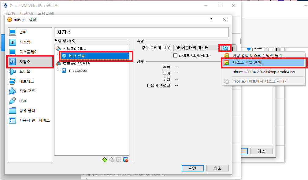 14. Ubuntu 이미지를 설정하기 위해서 저장소 > 비어 있음 > 디스크 버튼 > choose a disk file...버튼클릭