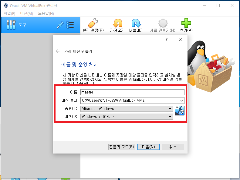 5. 이름, 머신폴더, 종류, 버전을 선택한다