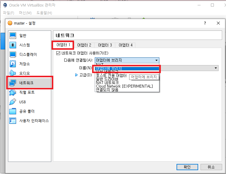 16. 네트워크 > 어댑터1 > 어탭터에 브리지 선택
