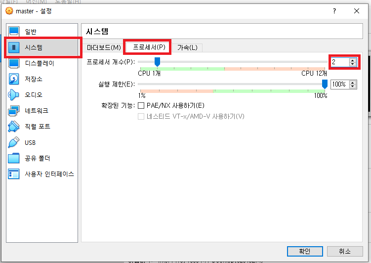 13. CPU 설정을 위해서 시스템->프로세서 탭에서 CPU 개수를 2개로 설정한다