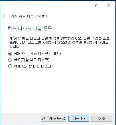8. VDI(VirtualBox 디스크 이미지)를 선택해준다