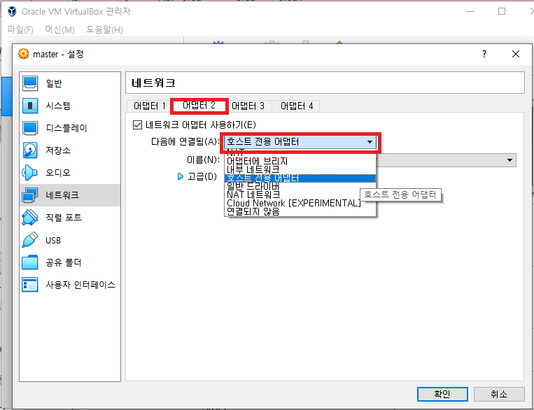 17. 어댑터2 > 호스트 전용 어댑터 선택 > 확인버튼을 누른다