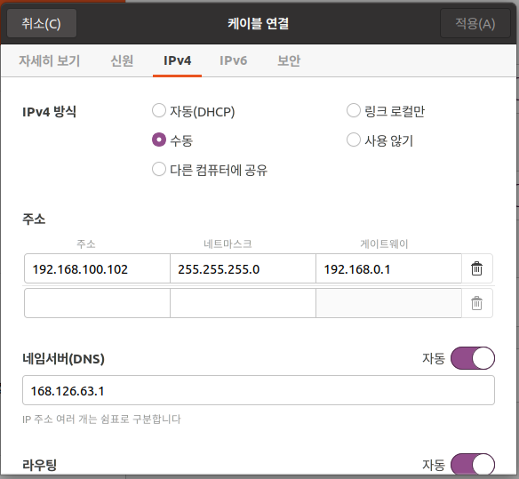전 글에서 고정 IP를 설정하긴 했지만 설정 -> 네트워크 -> 톱니바퀴 -> IPv4 -> IPv4 방식 -> 수동