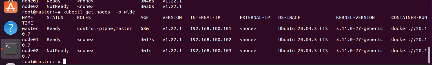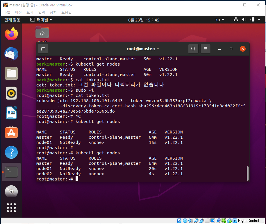 최종적으로 master node로 가서 kubectl get nodes를 입력한뒤 다음과 같이 node01, node02가 추가 된것을 확인하면