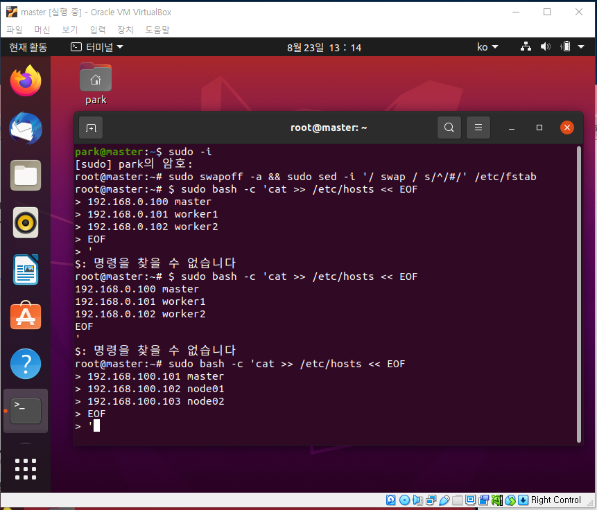 노란색으로 표시 된 내용을 master, work01, work02 가상환경에서 실행합니다.