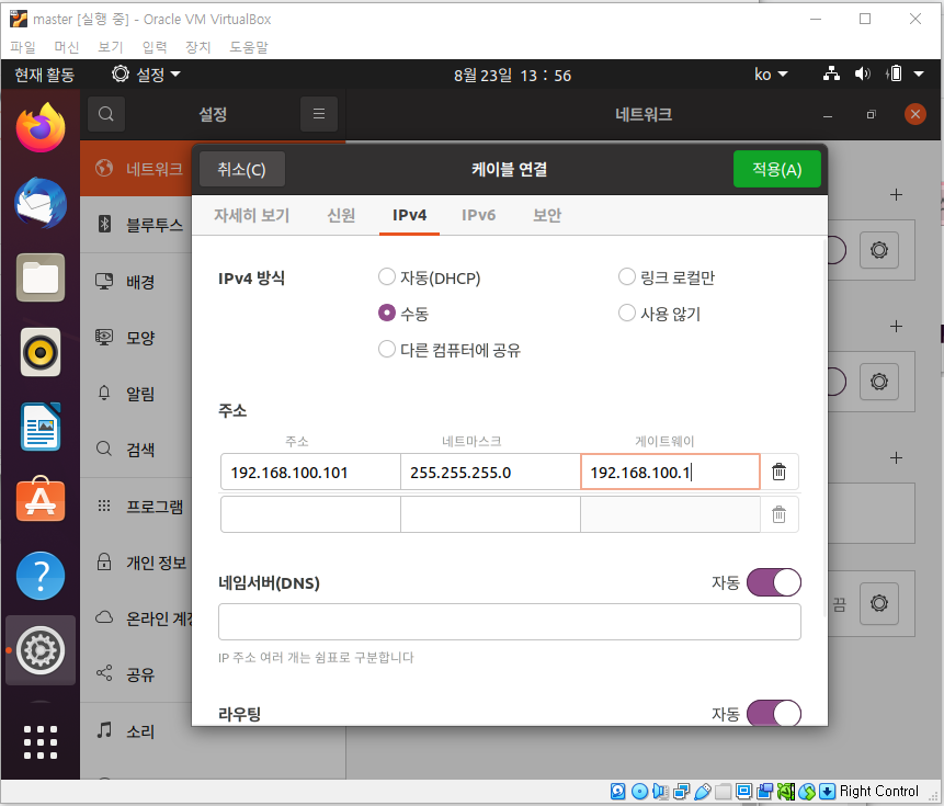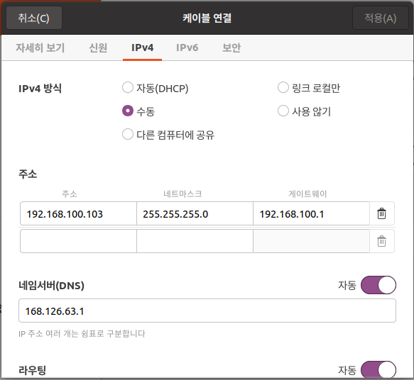 전 글에서 고정 IP를 설정하긴 했지만 설정 -> 네트워크 -> 톱니바퀴 -> IPv4 -> IPv4 방식 -> 수동
