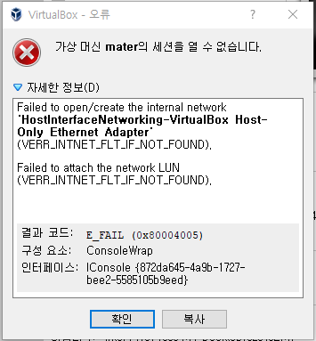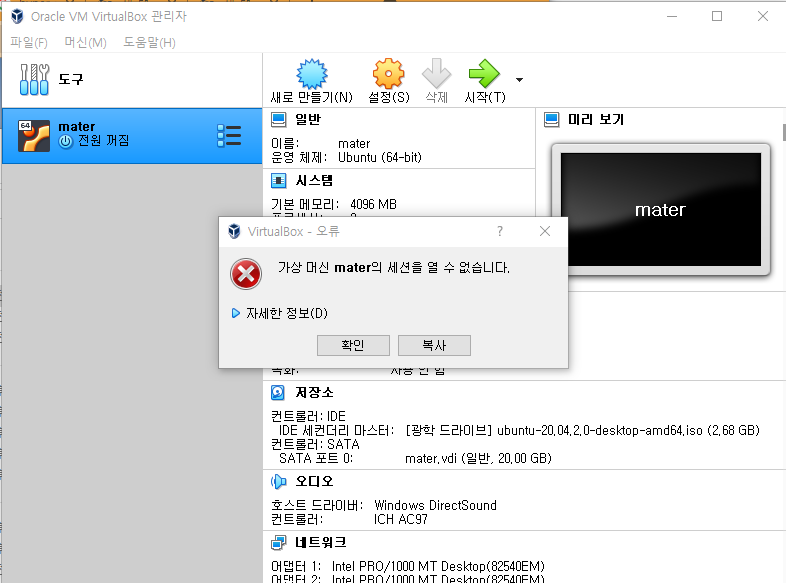 5. 아마 설치 후 VirtualBox를 실행하면 돌아가지 않을 겁니다... 그럼으로 다시 "어뎁터 설정 및 변경"으로 접속