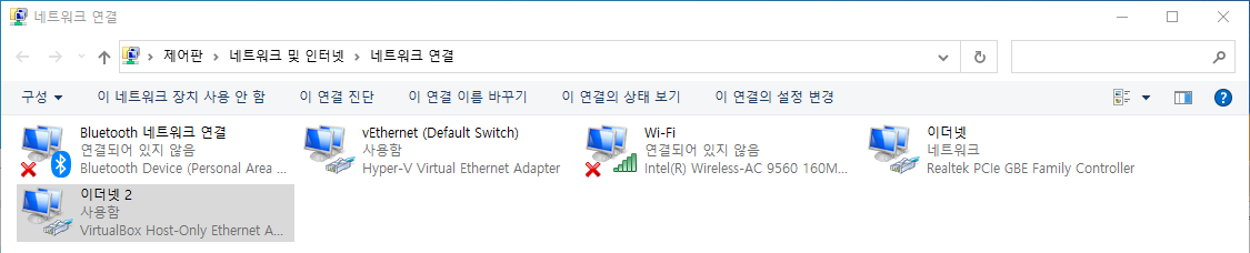 7. VirtualBox Host-Only Ethernet Adapter를 우클릭 -> 사용안함 으로 변경