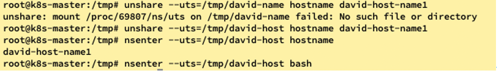 unshare 명령어를 이용하여 위에서 만든 파일에 hostname을 영속적으로 등록할 수 있도록 합니다. 여기서 --uts 옵션을 사용하면 만들려는 hostname을 등록할 수 있습니다.(linux unshare man 참고)