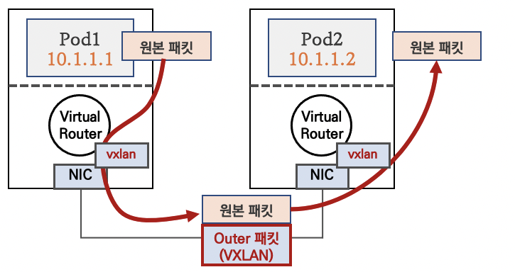- 다른 노드 간의 파드 통신은 vxlan 인터페이스를 통해 L2 프레임이 UDP - VXLAN에 감싸져서 상대측 노드로 도달 후 vxlan 인터페이스에서 Outer 헤더를 제거하고 내부의 파드와 통신
